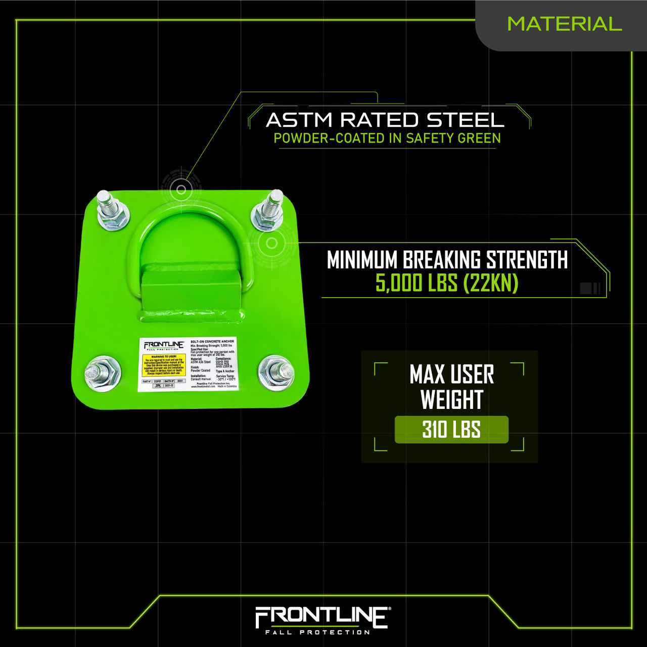 Frontline introduces the fall arrest bolt-on anchor plate, specifically designed for anchoring at concrete walls, ceilings, columns, or other concrete and steel structures. The anchor plate is easy, reusable and can be quickly installed and used in horizontal or vertical applications. It comes with four pre-drilled holes and all concrete anchor bolts are included and ready to use straight out of the bag.