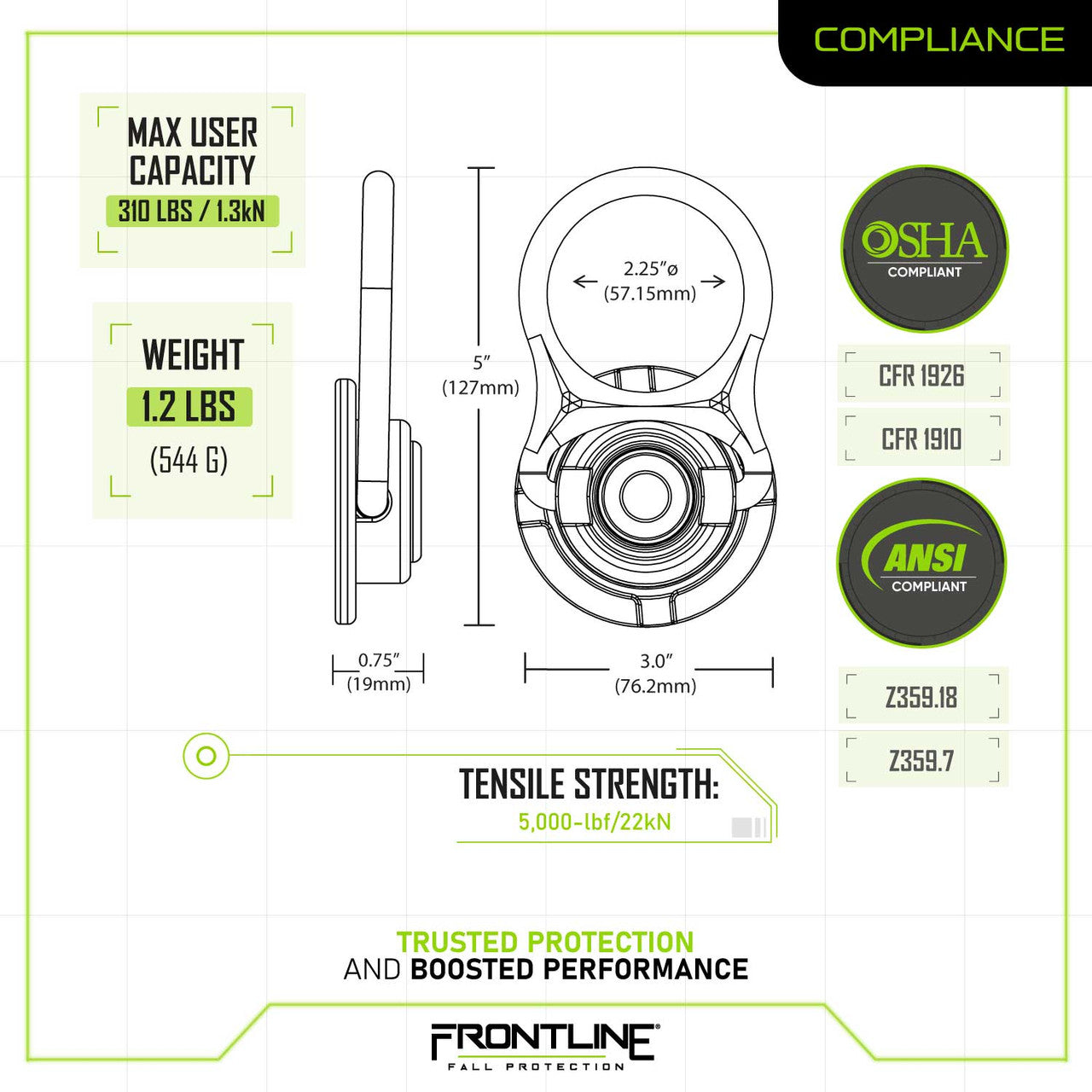 The Frontline MEGA Swivel of anchor family incorporates a revolutionary swivel ring design that allows a D-ring to rotate 360 degrees as well as flip back and forth at 180 degrees.