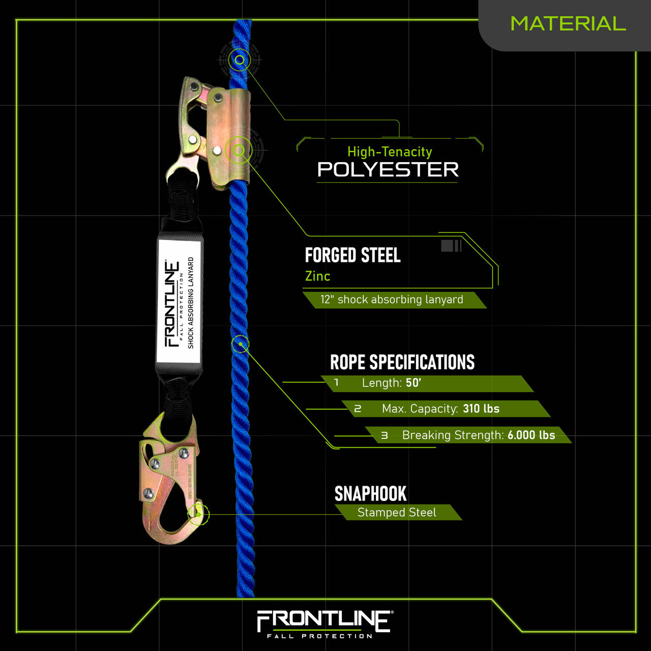 The integrated self-tracking manual rope grab with integrated 12" shock absorbing lanyard ensures maximum safety. The American blue, high-strength polyester rope provides excellent visibility, durability and style.